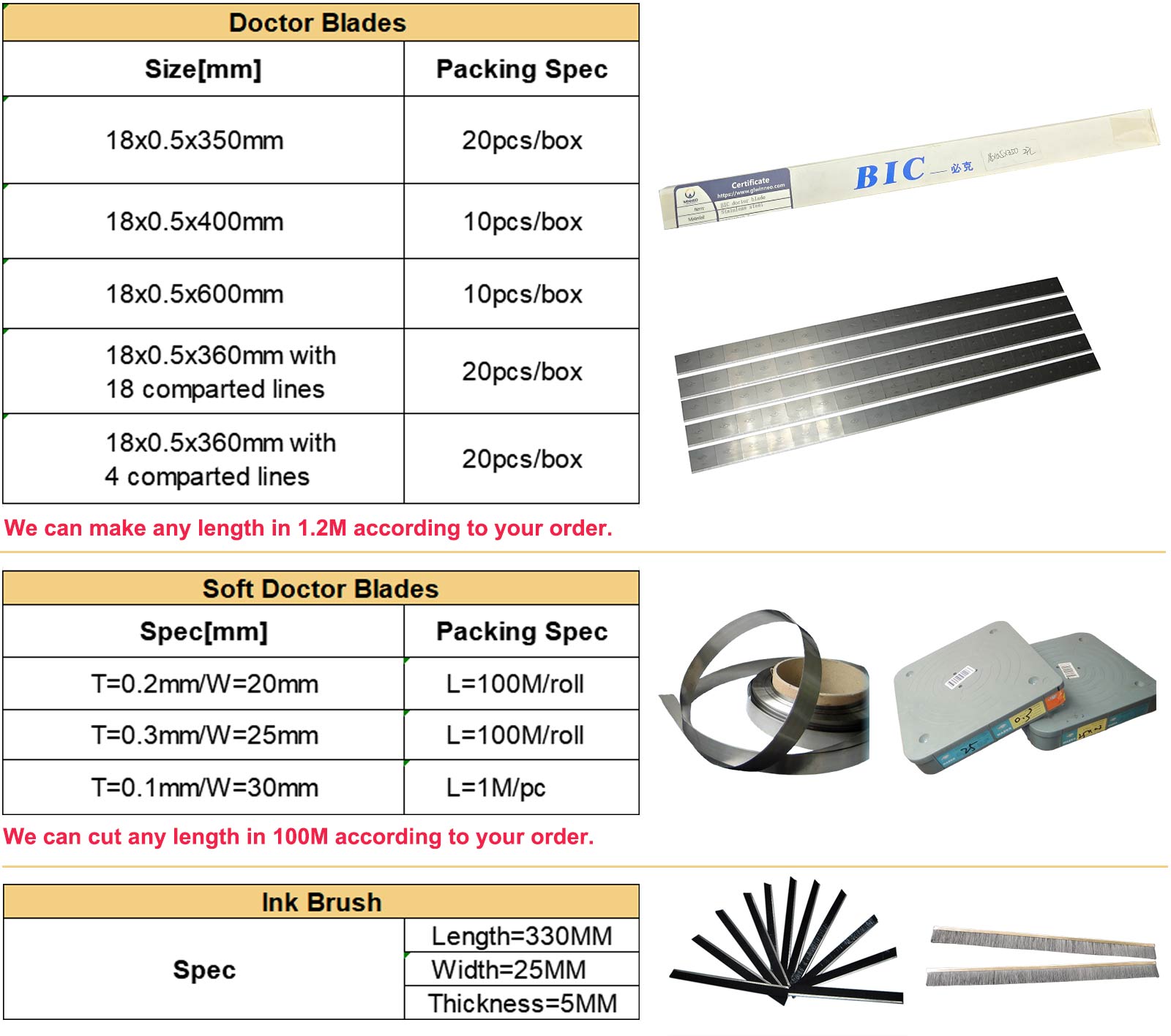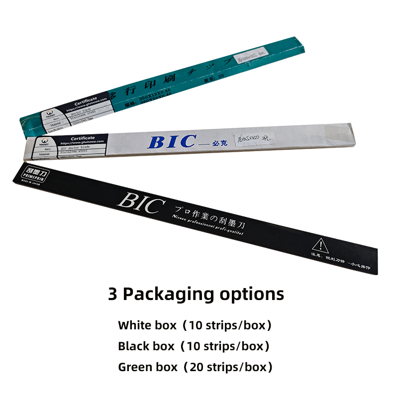 تتميز حافة الشفرة بهيكل مشطوف بدقة (زاوية قابلة للتعديل: 30 درجة/45 درجة/60 درجة) للتكيف مع مختلف درجات لزوجة الحبر (المائي، والمذيب، والقابل للمعالجة بالأشعة فوق البنفسجية) وأسطح الركيزة (الناعمة/الخشنة). يمنع تراكم الحبر أو الكشط المفرط، مما يقلل من معدلات إعادة العمل.